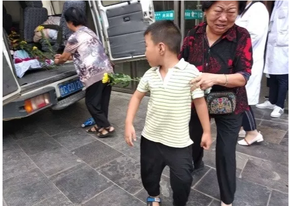 6岁的儿子跪在遗体前,