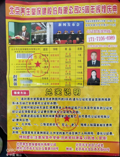 界首市公证处迎来了一位手拿“兑奖券”老人,该老人笑容满面的说道:“运气太好,中大奖了,来公证一下”。我处公证员立即上前接待,经详细询问发现老人是在某保健品广告中获得一张的中奖单,中奖单上面的刮奖区刮到了”百万的巨奖“需办理公证手续去领奖。
