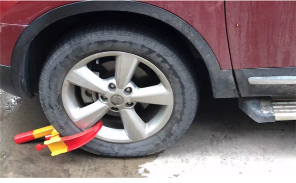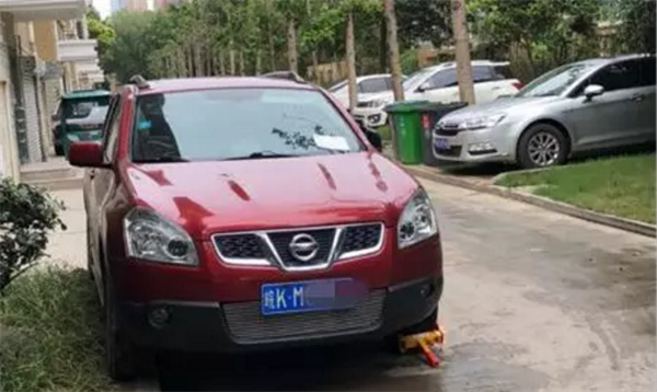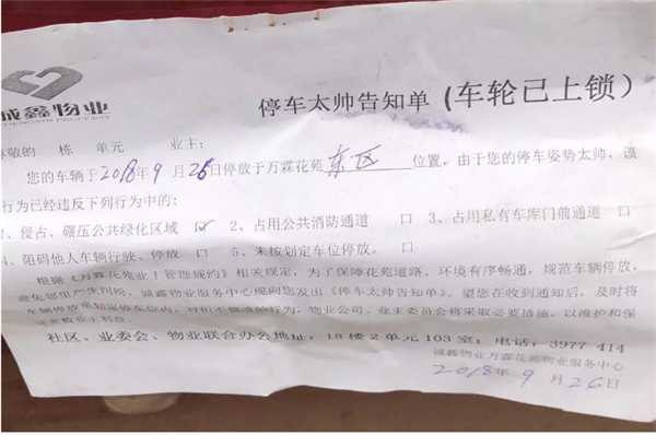 市民李先生家住阜城万霖花苑小区早上出门时他发现一辆红色小轿车停放在小区的消防通道上图中可见这辆红色轿车停在路边堵住了大半个通道正当李先生默默谴责乱停车的人时发现车的前轮被锁上了而且车前还被贴上一张“停