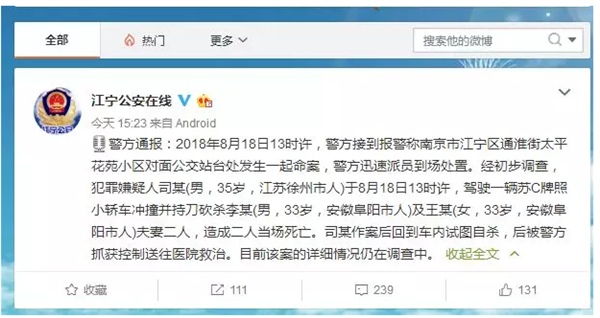 昨日下午15:23分,新浪微博认证为南京市公安局江宁分局新浪微博社区委员会专家成员的@江宁公安在线 发布了一则警方通报《阜阳一对夫妻在南京市江宁区被人持刀砍杀身亡》,具体内容如下。2018年8月18日