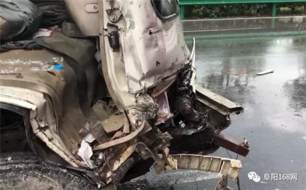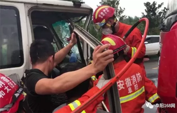 8月17日下午16时许,106国道太和县双浮镇加油站旁一辆大货车与小货车相撞,两车头部不同程度受损,小货车内一人被困。小货车上司机的妻子被困车中。消防员立即使用液压破拆工具将副驾驶一侧车门卸下,实施救
