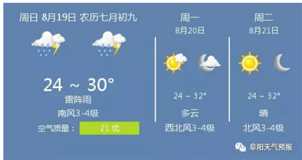 8月20日阜阳天气:多云,温度 23 ~ 30℃,西北风3-4级,日出时间 05:43,日落时间 18:57。实时:气温 23℃,西北风2级,湿度 99%,气压 1000 hPa。安徽省蓝色暴雨预警: